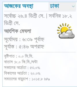 আজ সন্ধ্যা ০৬ টায় ঢাকায় বাতাসের আপেক্ষিক আর্দ্রতা ছিল: ৬৪%,আগামীকাল ঢাকায় সূর্যান্ত আগামীকাল ঢাকায় সূর্যোদয়: সন্ধ্যা ০৫ টা ৪৬ মিনিট। : ভোর ০৬ টা ৩৯ মিনিট।