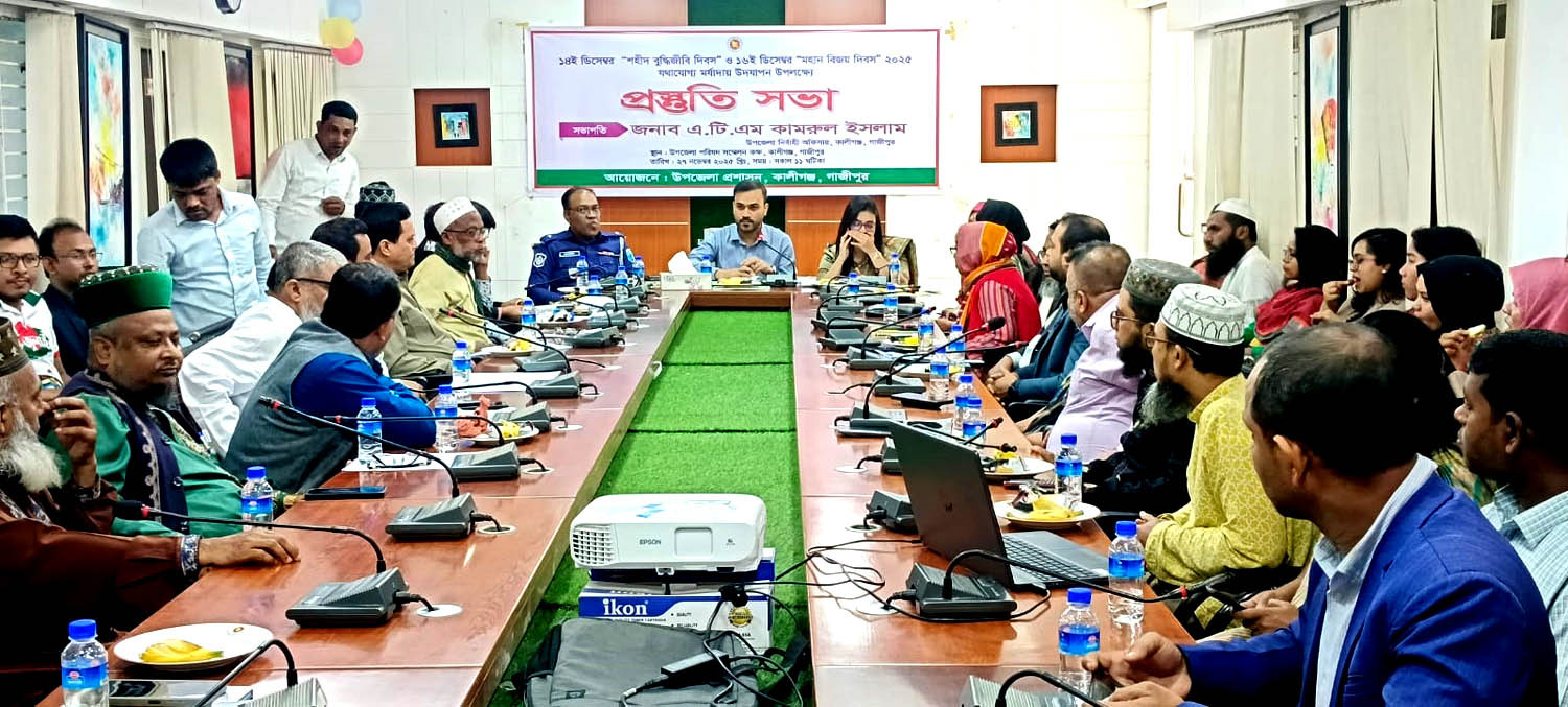 গাজীপুরের কালীগঞ্জ উপজেলা প্রশাসনের উদ্যোগে শহীদ বুদ্ধিজীবী ও মহান বিজয় দিবস উদযাপন উপলক্ষ্যে প্রস্তুতিমূলক আলোচনা সভা অনুষ্ঠিত হয়েছে।