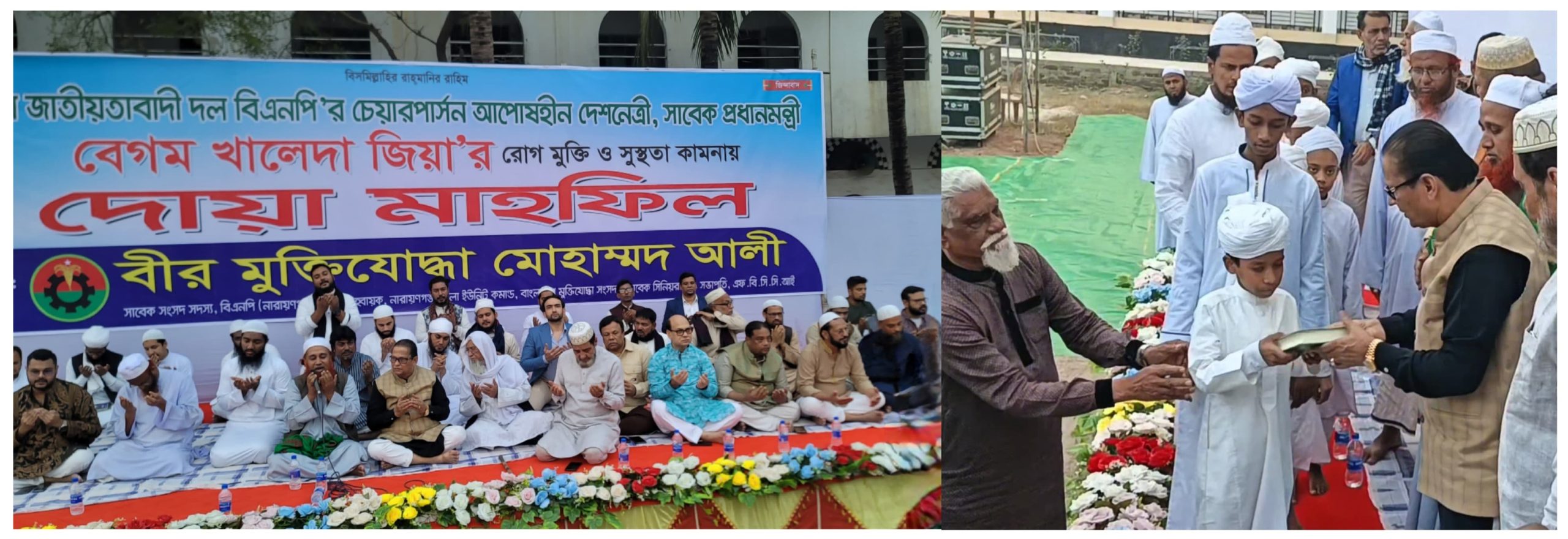 বিএনপি চেয়ারপার্সন ও সাবেক প্রধানমন্ত্রী বেগম খালেদা জিয়ার সুস্থতা কামনা করে নারায়ণগঞ্জ ফতুল্লার কাশীপুর এলাকায় জামি'আ মাদানিয়া কাসেমুল উলূম মাদ্রাসার মাঠে এতিম ও মাদ্রাসা শিক্ষার্থীদের নিয়ে কোরআন বিতরণ, খতম ও দোয়ার আয়োজন করেন নারায়ণগঞ্জ -৪ আসনের বিএনপির সাবেক সংসদ সদস্য ও নারায়ণগঞ্জ জেলা মুক্তিযোদ্ধা সংসদের আহ্বায়ক বীর মুক্তিযোদ্ধা মোহাম্মদ আলী।