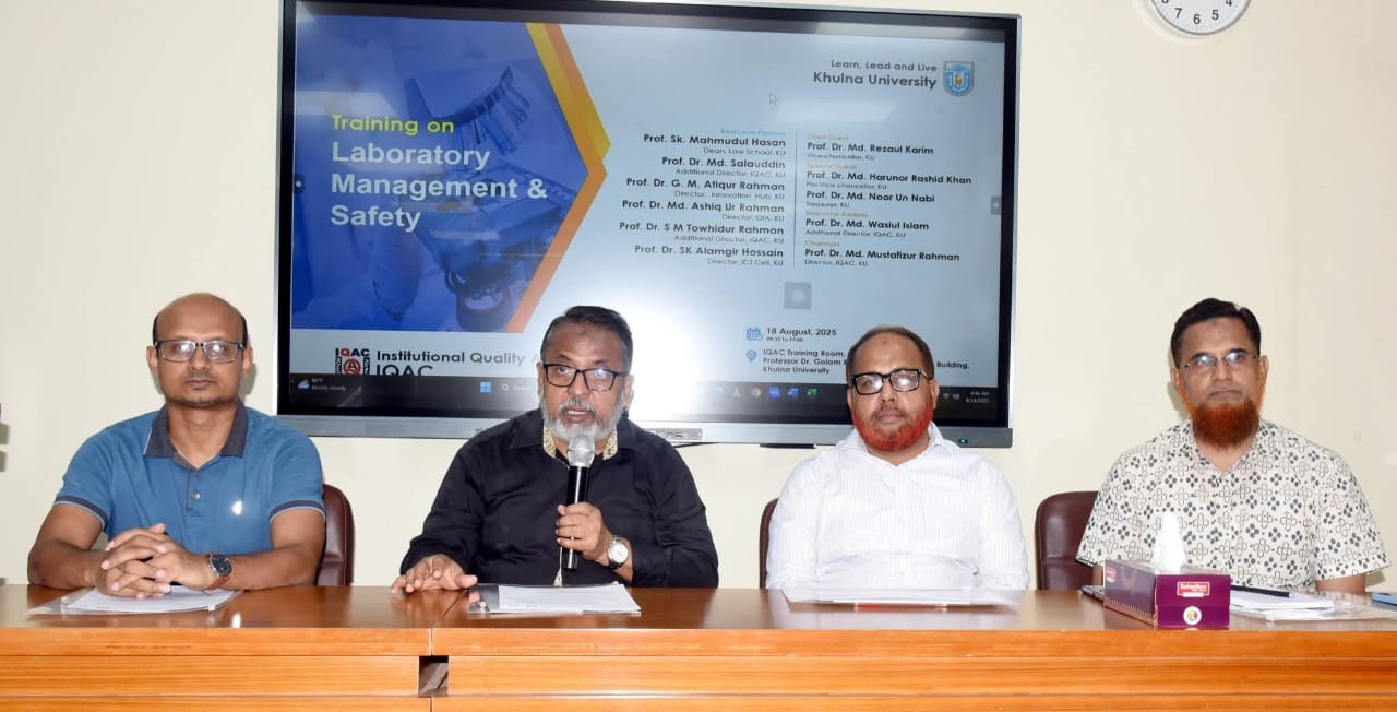খুলনা বিশ্ববিদ্যালয়ের ইনস্টিটিউশনাল কোয়ালিটি অ্যাসুরেন্স সেল (আইকিউএসি)-এর উদ্যোগে ‘ল্যাবরেটরি ম্যানেজমেন্ট এন্ড সেফটি’ শীর্ষক দিনব্যাপী এক প্রশিক্ষণ অনুষ্ঠিত হয়েছে। আজ ১৮ আগস্ট (সোমবার) সকাল ৯.৩০ মিনিটে এ প্রশিক্ষণের উদ্বোধনী অনুষ্ঠানে প্রধান অতিথির বক্তব্য রাখেন উপাচার্য প্রফেসর ড. মোঃ রেজাউল করিম।
