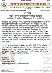 দেশের ইতিহাসে সর্বপ্রথম সাইবার রাজনৈতিক সংগঠন ‘বাংলাদেশ জাতীয়তাবাদী সাইবার ইউজার দল’ গাজা ও রাফায় ইসরায়েলের বর্বরোচিত গণহত্যার তীব্র নিন্দা ও প্রতিবাদ জানাচ্ছে। একইসাথে শহীদ এবং যুদ্ধাহত ফিলিস্তিনিদের প্রতি সহমর্মিতা প্রকাশ করে আগামী ০৭ এপ্রিল বিশ্বব্যাপী ‘The World Stops for Gaza’ কর্মসূচির প্রতি সংহতি প্রকাশ করছে।
