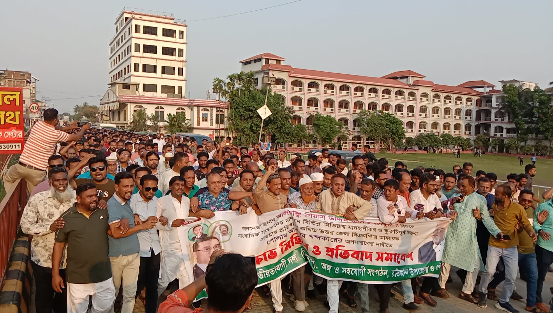 রাউজানে কেন্দ্রীয় বিএনপি’র ভাইস চেয়ারম্যান গিয়াস উদ্দিন কাদের চৌধুরীর বিরুদ্ধে সাংবাদিক সম্মেলনের মাধ্যমে বিভিন্ন মিডিয়ায় মানহানিকর ও কুরুচিপূর্ণ বক্তব্য দেওয়ার প্রতিবাদে উত্তর জেলা বিএনপি’র আহবায়ক গোলাম আকবর খন্দকারের অপসারণ দাবিতে বিক্ষোভ মিছিল ও প্রতিবাদ সমাবেশ অনুষ্ঠিত হয়েছে। রবিবার, ২৭ এপ্রিল বিকালে উপজেলা ও পৌরসভার বিএনপি এবং অঙ্গসংগঠন সমূহের ব্যানারে বিক্ষোভ মিছিল ও প্রতিবাদ সামাশের আয়োজন করা হয়। রাউজান পৌর সদর মুন্সিরঘাটাস্থ দলীয় কার্যালয়ের সামনে থেকে বিক্ষোভ মিছিল শুরু করে মাস্টার দা সূর্যসেন চত্বর হয়ে মুন্সিরঘাটা, এবং রাউজান প্রেসক্লাব হয়ে জলিল নগরে গিয়ে শেষ হয়। গোলাম আকবর খোন্দকারের কুশপুত্তলিকা নিয়ে মিছিলে অংশগ্রহণকারীরা বিভিন্ন স্লোগান দিতে দেখা যায়। সমাবেশে সভাপতিত্ব করেন পৗরসভা বিএনপি’র সাবেক সাধারণ সম্পাদক সৈয়দ মঞ্জুরুল হক। চট্টগ্রাম উত্তর জেলা যুবদলের সহ-সভাপতি সাবের সুলতান কাজলের সঞ্চালনায় প্রধান অতিথি ছিলেন উত্তর জেলা বিএনপি’র সদস্য আবু জাফর চৌধুরী। বক্তব্য রাখেন উপজেলা বিএনপি নেতা বিএনপি নেতা ফিরোজ আহমেদ, হাবিব উল্লাহ মাস্টার, সোহেল, লিটন মহাজন, ইউসুফ তালুকদার, রেজাউল, শাহজান সাহিল, শাহাদাত মির্জা, তসলিম উদ্দিন ইমন, রাসেল খান, একরাম। উপস্থিত ছিলেন সৈয়দ কামাল, আজম, মুসলেহ উদ্দিন, ইঞ্জিনিয়ার আবু মোহাম্মদ, হারুন অর রশিদ, নজরুল ইসলাম, ফরিদ আহমেদ, মোজাম্মেল হক, মাসুদ আলম, এরশাদ চৌধুরী, ইকবাল চৌধুরী, ইউসুফ তালুকদার, খোরশেদ, সৈয়দ মো. তৌহিদুল আলম, নিজাম উদ্দিন সুজন, সাঈদ বিন রানা, মোজাহের আলম, দিদার তালুকদার, ওমার ফারুক, জানে আলম, সেলিম উদ্দিন, দিদারুল আলম, সোহেল, জাকের হোসেন বাহাদুর কাজী গিয়াস, হাসান বাহাদুর, মাহমুদ কোম্পানী, ছোটন আজম, আবু বক্কর সিদ্দিক, মো. আলী সুমন, আরিফ ইসলাম, রিয়াজ উদ্দিন, আবদুল শুক্কুর, মানিক, সালাউদ্দিন, সাইফুদ্দিন রিবন, আনোয়ার, মঞ্জুরুল আলম, রিয়াজ উদ্দিন, মো. রেওয়াজ, সেকান্দর হিরো, শহীদ, ফরিদ উদ্দিন রানা, সোহেল, সাহেদ, জাবেদ, পারভেজ, মানিক, মোঃ মঈনউদ্দীন বিপুল, মোঃ জামাল উদ্দীন তালুকদার, মোঃ ওসমান গনি রুবেল, মোঃ সহিদুল ইসলাম পারভেজ।মিছিল সমাবেশ পরবর্তী গোলাম আকবর খোন্দকারে কুশপুত্তলিকা দাহ করা হয়। বক্তারা বলেন, বিএনপি’র কেন্দ্রীয় নেতার বিরুদ্ধে মানহানিকর ও কুরুচিপূর্ণ বক্তব্য দিয়ে গোলাম আকবর খন্দকার উত্তর জেলা বিএনপি’র আহবায়ক পদে থাকার অধিকার রাখতে পারে না। ক্ষমা না চাইলে তাকে এবং তার অনুসারীদের রাউজানে অবাঞ্চিত করা হবে বলে ঘোষণা দেওয়া হয়। তাছাড়া সংবাদ সম্মেলনে রাউজানে কোন কোন ইউনিয়নে অস্ত্র মজুদ আছে তা নিজের মুখেই স্বীকার করেছেন, তাকে আইনের আওতায় আনার জ