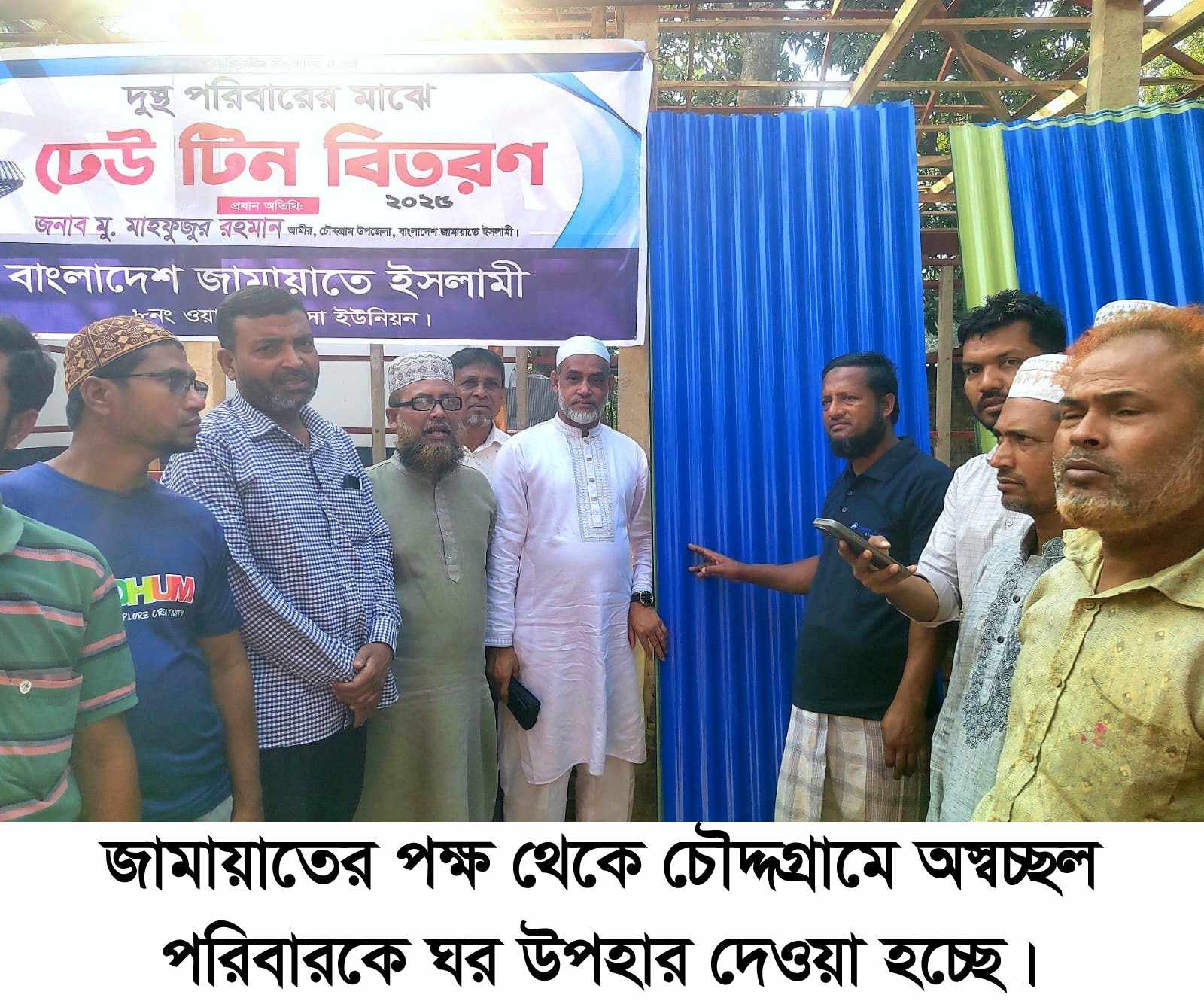 কুমিল্লার চৌদ্দগ্রাম উপজেলার বাতিসা ইউনিয়নের জামুকরা গ্রামের ইউনুছ মিয়ার পরিবারকে জামায়াতে ইসলামী’র পক্ষ থেকে একটি নতুন ঘর উপহার দেওয়া হয়েছে। জামায়াতে ইসলামীর ব্যতিক্রমী এই উদ্যোগের মাধ্যমে জামায়াতে ইসলামী তাদের মানবিক দায়িত্ব পালন করেছে এবং একটি অস্বচ্ছল পরিবারের জন্য সুরক্ষিত আশ্রয়ের ব্যবস্থা করেছে। জামায়াতের এ উদ্যোগটি বেশ প্রশংসা কুড়িয়েছে স্থানীয় সচেতন মহলের। সুবিধাভোগি পরিবারের পক্ষ থেকে জামায়াতের প্রতি আন্তরিক কৃতজ্ঞতা জ্ঞাপন করা হয়েছে।