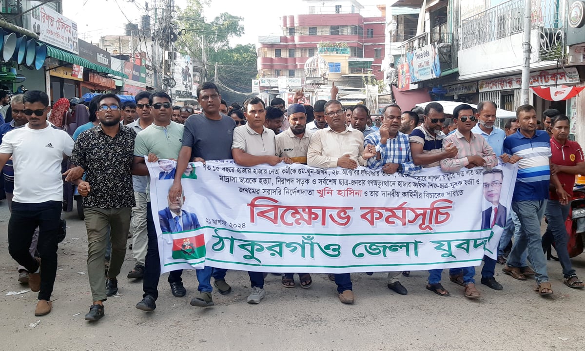 ১৫ বছরে হাজার হাজার নেতা কর্মীকে গুম-খুন-জখম, লগিবৈঠার তান্ডব, শাপলা চত্বরে হেফাতের সমাবেশে শত শত আলেম-ওলামা মাদ্রাসা ছাত্রকে হত্যা, নিরপদ সড়ক ও সর্বশেষ ছাত্র-জনতার গণঅভ্যুত্থানে হাজার অধিক শিশু-ছাত্র-যুবক হত্যা ও জখমের সরাসরি নির্দেশদাতা খুনি হাসিনা ও তার দানবীয় কাহিনীর বিচারের দাবিতে ঠাকুরগাঁওয়ে বিক্ষোভ কর্মসূচী পালিত হয়।