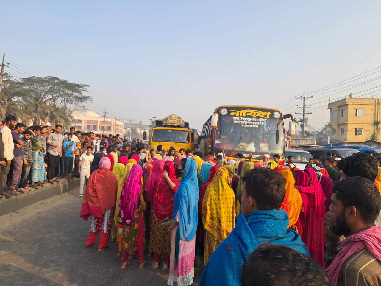 বেতন বাড়ানো ও নতুন বেতন কাঠামো বাস্তবায়নের দাবিতে গাজীপুরের শ্রীপুরে ঢাকা-ময়মনসিংহ মহাসড়ক অবরোধ করে শ্রমিকরা।