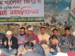 দোয়া মাহফিলে বিএনপি চেয়ারপার্সন বেগম খালেদা জিয়ার দ্রুত সুস্থতা ও দীর্ঘায়ু কামনা করে বিশেষ মোনাজাত পরিচালনা করে পাশাপাশি শহীদ প্রেসিডেন্ট জিয়াউর রহমান, ভারপ্রাপ্ত চেয়ারম্যান তারেক রহমান, জিয়া পরিবারের সদস্যদের মঙ্গল কামনা করা হয়।
