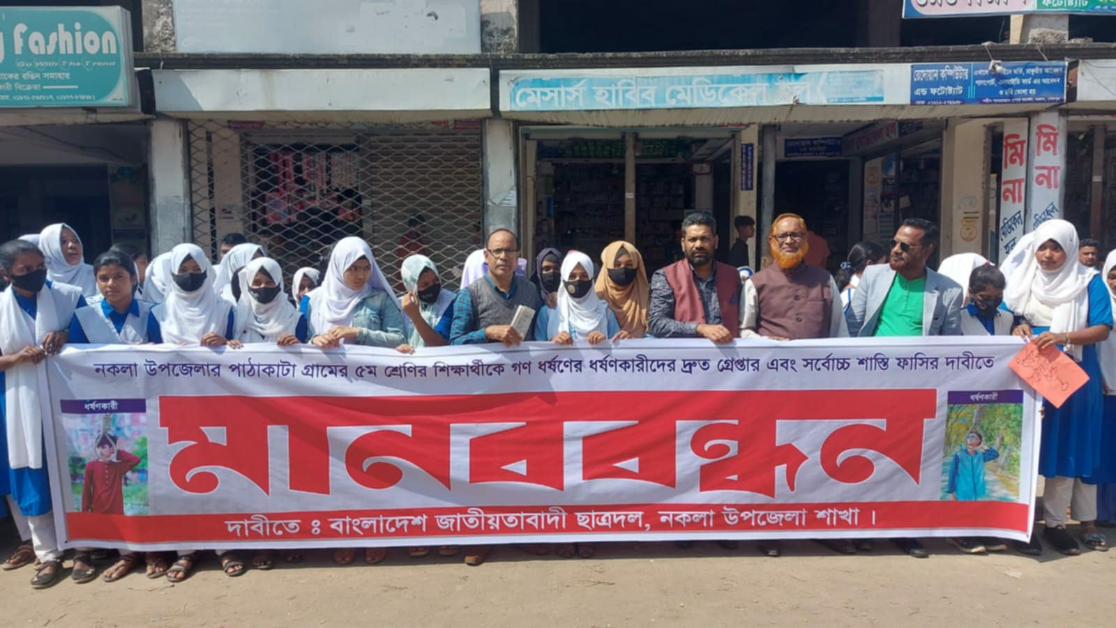 নকলায় পঞ্চম শ্রেণির শিক্ষার্থীকে গণধর্ষণের ঘটনায় মানববন্ধন