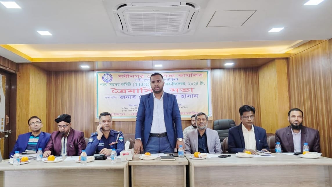 সভাপতিত্ব করেন নবীনগর পৌরসভার প্রশাসক ও শহর সমন্বয় কমিটির সভাপতি মো. মাহমুদুল হাসান। নবীনগর প্রেসক্লাবের সভাপতি মোহাম্মদ হোসেন শান্তি, উপজেলা প্রকৌশলী মাহাবুব হোসেন, পৌরসভার নির্বাহী প্রকৌশলী আরিফ সারোয়ার বাতেন, নবীনগর থানার ভারপ্রাপ্ত কর্মকর্তা (ওসি) রফিকুল ইসলাম, পৌর নির্বাহী কর্মকর্তা বেলজুর রহমান খানসহ TLCC-এর সম্মানিত সদস্যবৃন্দ এবং বিভিন্ন সরকারি-বেসরকারি দপ্তরের প্রতিনিধিরা উপস্থিত ছিলেন।