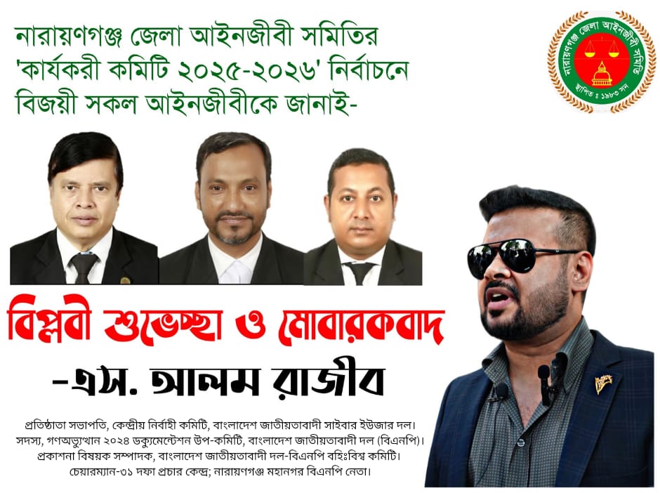 গতকাল অনুষ্ঠিত নারায়ণগঞ্জ জেলা আইনজীবী সমিতির 'কার্যকরী কমিটি নির্বাচন ২০২৫-২০২৬'-এর নবনির্বাচিত সভাপতি এডঃ সরকার হুমায়ূন কবীর, সাধারণ সম্পাদক এডঃ এইচ. এম. আনোয়ার প্রধান, সমাজ সেবা সম্পাদক এডঃ রাজিব মন্ডল সহ বিজয়ী সকল আইনজীবীদেরকে বাংলাদেশ জাতীয়তাবাদী সাইবার ইউজার দল (বিএনসিইউপি)'র পক্ষ থেকে অভিনন্দন ও শুভেচ্ছা জানিয়েছেন কেন্দ্রীয় বিএনপির গণঅভ্যুত্থানঃ২০২৪ ডক্যুমেন্টেশন উপ-কমিটির সদস্য, বাংলাদেশ জাতীয়তাবাদী সাইবার ইউজার দল-কেন্দ্রীয় নির্বাহী কমিটির প্রতিষ্ঠাতা সভাপতি ও নারায়ণগঞ্জ মহানগর বিএনপি নেতা এস. আলম রাজীব।