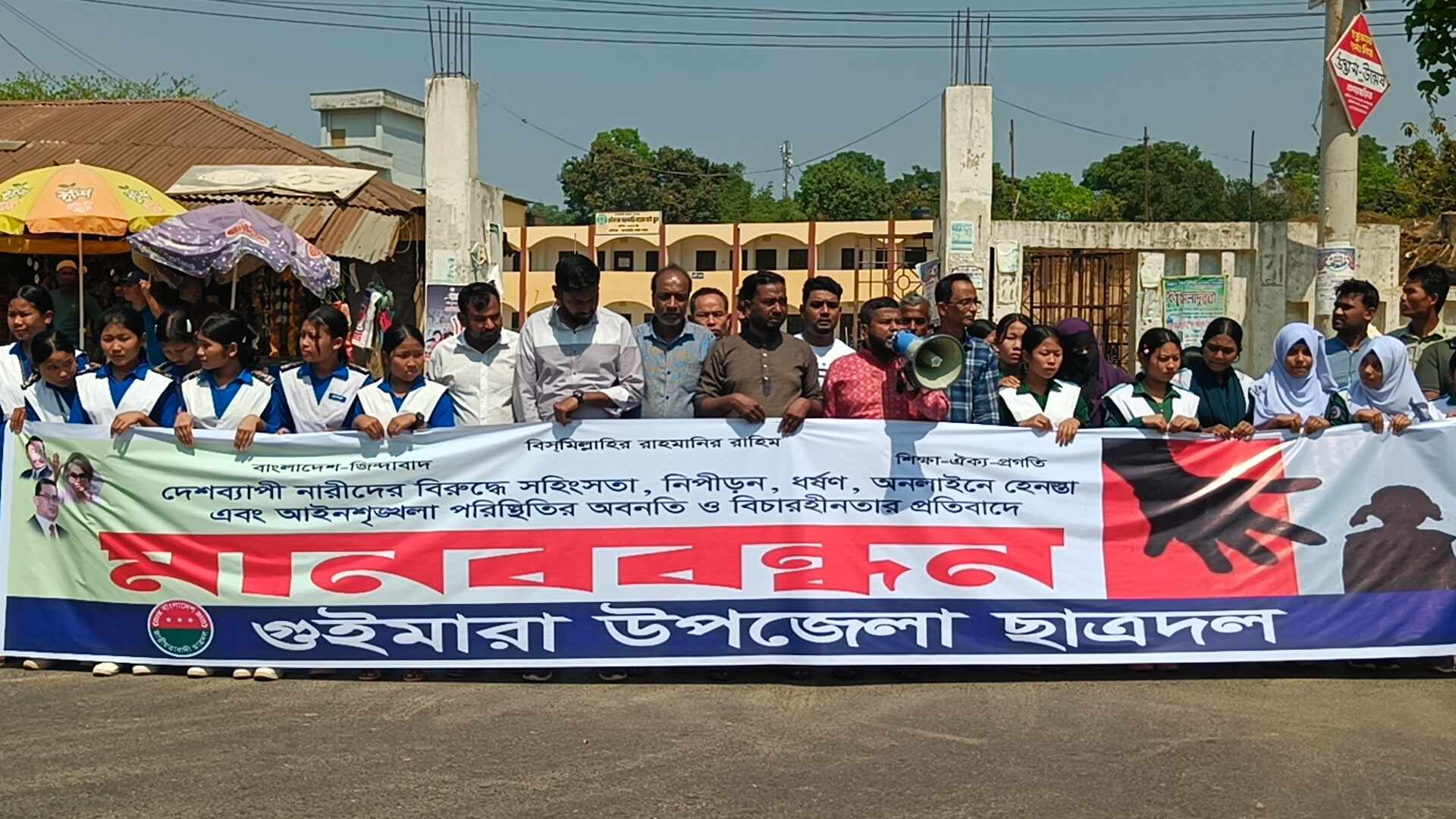 দেশব্যাপী নারীর প্রতি সহিংসতা, নিপীড়ন, ধর্ষণ, অনলাইনে হেনস্তা এবং আইন-শৃঙ্খলা পরিস্থিতির অবনতির প্রতিবাদে গুইমারা উপজেলা ছাত্রদল এক মানববন্ধন আয়োজন করেছে।