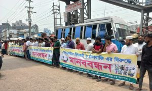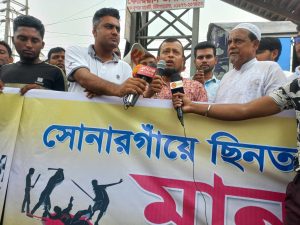 মানববন্ধনে আরো উপস্থিত ছিলেন সোনারগাঁ পরিবেশক সমিতির কোষাধ্যক্ষ মোঃ মোশারফ হোসেন, সাংগঠনিক সম্পাদক মাসুম আহমেদ, প্রচার সম্পাদক মোহাম্মদ আজিজুল হক প্রমুখসহ সোনারগায়ের ব্যবসায়ী ও সাধারণ মানুষ।