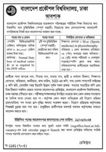 বাংলাদেশ প্রকৌশল ও প্রযুক্তি বিশ্ববিদ্যালয়ের (বুয়েট) ছাত্রকল্যাণ পরিদপ্তরের শারীরিক শিক্ষা বিভাগে ‘স্পোর্টস ফিজিওথেরাপিস্ট’ পদে নিয়োগ দেওয়া হবে। আগ্রহী প্রাথীগণ আগামী ১১ জুনের মধ্যে আবেদন করতে পারবেন।