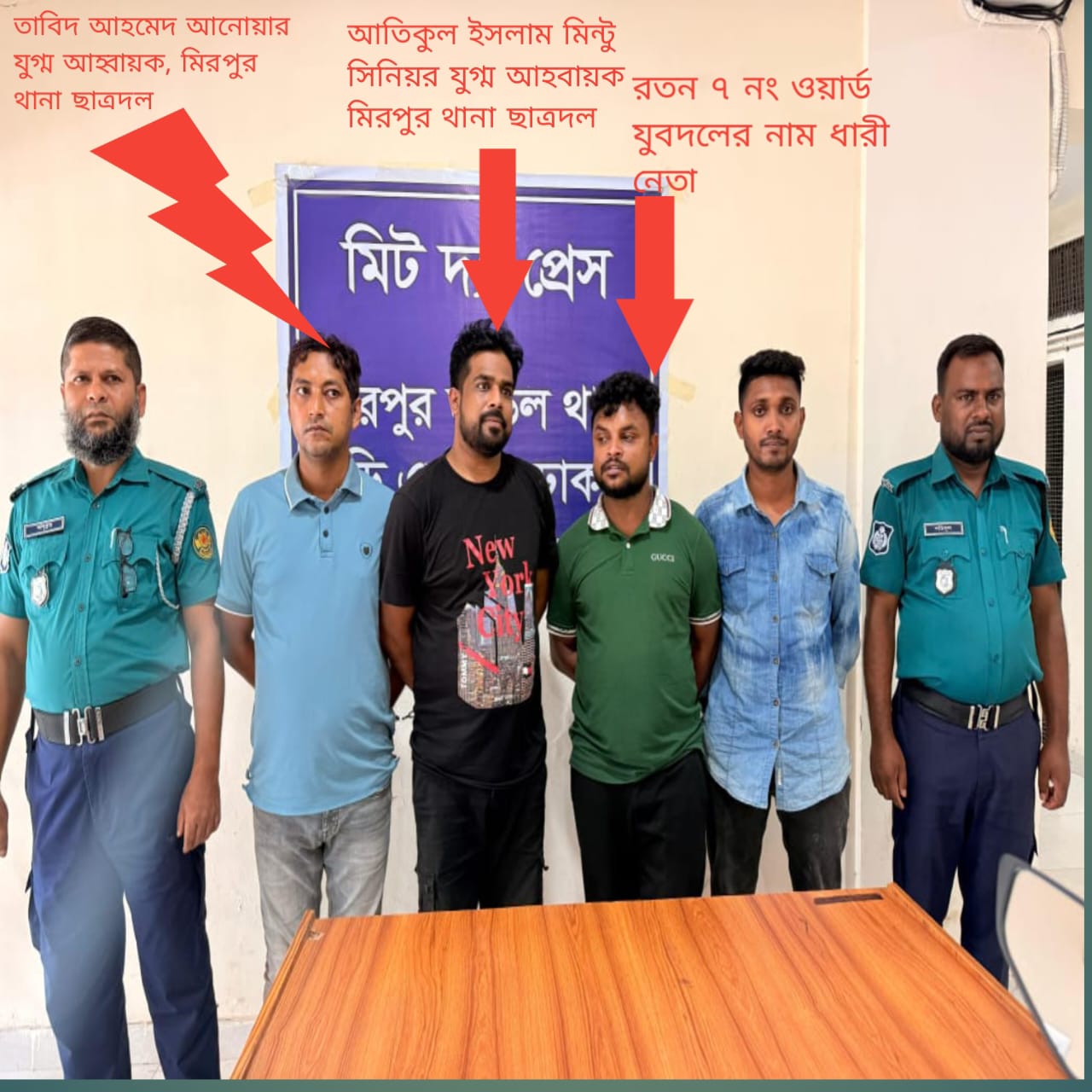 মিরপুরের পশ্চিম মনিপুরে একটি বাসায় চাঁদাবাজির ঘটনায় চারজনকে গ্রেফতার করেছে ডিএমপির মিরপুর মডেল থানা পুলিশ। গ্রেফতারকৃতরা হলো- ১। আনোয়ার হোসেন তাবিদ (৩৫), ২। মোঃ মিন্টু মিয়া (৩৫), ৩। মোঃ রতন মিয়া (৩৪) ও ৪। মোঃ ইসমাইল হোসেন (২৪)।