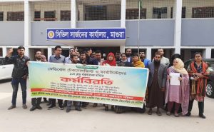 স্বাস্থ্য ও পরিবার কল্যাণ মন্ত্রণালয়ের অধীনে সারাদেশের সকল সরকারি মেডিকেল সেন্টারের ডিপ্লোমা মেডিকেল টেকনোলজিস্ট ও ফার্মাসিস্টদের দশম গ্রেড বাস্তবায়নের দাবিতে মাগুরায় বুধবার অর্ধ দিবস কর্মবিরতি পালিত হয়েছে।