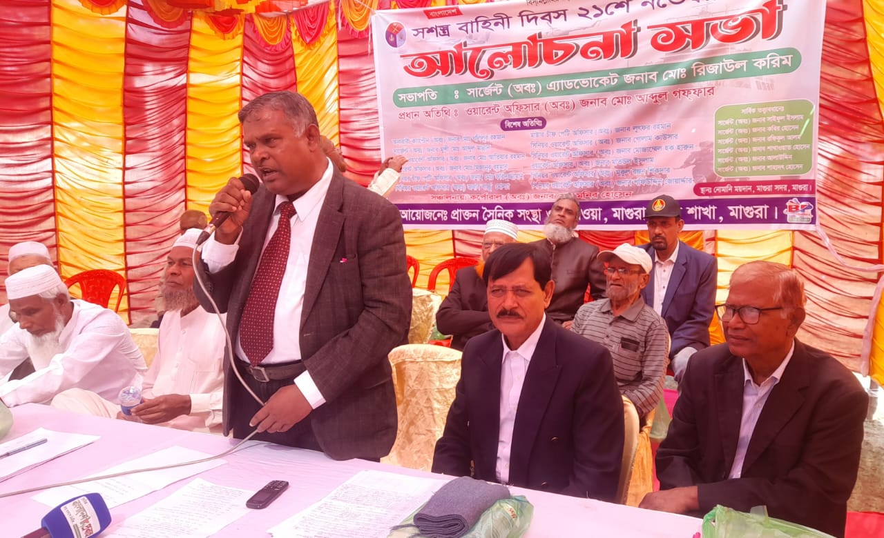 মাগুরায় প্রাক্তন সৈনিকদের উদ্যোগে ২১ নবেম্বর সশস্র বাহিনী দিবস পালিত হয়েছে। প্রাক্তন সৈনিক সংস্থা মাগুরা শাখা দিবসটি পালন উপলক্ষে মাগুরা নোমান ময়দানে ২১ নবেম্বর শুক্রবার সকালে এক আলোচনা সভার আয়োজন করে। সভায় সভাপতিত্ব করেন অবসর প্রাপ্ত সার্জেন্ট এডভোকেট রেজাউল করীম, সভায় প্রধান অতিথি হিসেবে বক্তব্য্য রাখেন অবসরপ্রাপ্ত ওয়ারেন্ট অফিসার আব্দুল গফফার, বিশেষ অতিথি হিসেবে উপস্থিত ছিলেন অবসরপ্রাপ্ত অনারারী ক্যাপ্টেন খলিলুর রহমান, মাস্টার চীফ পেটি অফিসার লুৎফর রহমান, অবসরপ্রাপ্ত সার্জেন্ট আবদুল মান্নান, অবসরপ্রাপ্ত ওয়ারেন্ট অফিসার আতিয়ার রহমান, মিজানুর রহমান প্রমুখ। বক্তারা তাঁতের বক্তব্যে অবসর জীবনে নানান সমস্যা তুলে ধরে সমস্যা নিরুপন করে সমাধানের জন্য সেনা বাহিনীর কর্মকর্তাদের নিকট আহবান জানান। সভায় মাগুরা জেলার শতাধিক অবসরপ্রাপ্ত সৈনিক বৃন্দ উপস্থিত ছিলেন।