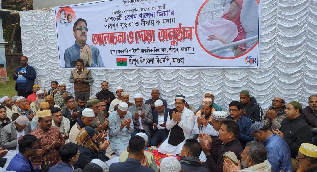 মাগুরার শ্রীপুর সরকারি এম সি পাইলট মাধ্যমিক বিদ্যালয় মাঠ প্রঙ্গনে বুধবার বিকেলে বাংলাদেশের ৩ বারের প্রধান মন্ত্রী বেগম খালেদা জিয়ার রোগমুক্তি কামনায় আলোচনা সভা ও বিশেষ দোয়া মাহফিল অনুষ্ঠিত হয়েছে।