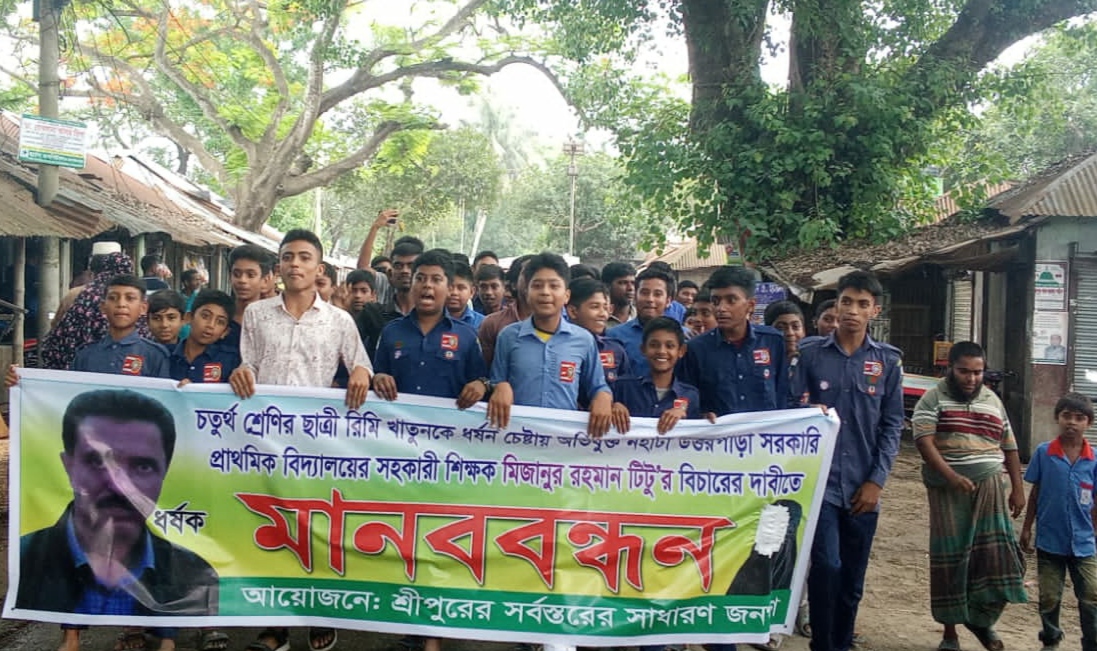 মাগুরায় শিক্ষার্থীকে শ্লীলতাহানী মামলায় অভিযুক্ত শিক্ষকের বিচারের দাবিতে মানববন্ধন ও বিক্ষোভ মিছিল অনুষ্ঠিত