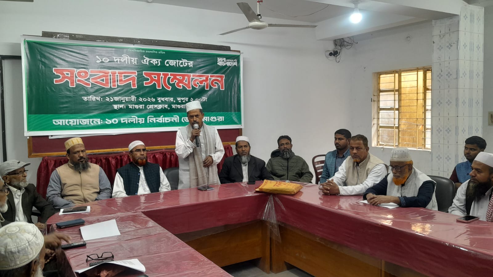 সাধারণ সম্পাদক মোঃ সামসুজ্জামান এবং বাংলাদেশ ডেভেলপমেন্ট পার্টির সভাপতি কাজী আওয়ালসহ আরো অনেকে। সংবাদ সম্মেলনে বক্তারা বলেন, আগামী ত্রয়োদশ জাতীয় সংসদ নির্বাচনকে সামনে রেখে মাগুরায় ১০ দলীয় ঐক্য জোট পুরো প্রস্তুত রয়েছে। বৃহস্পতিবার থেকে মাগুরা ১০ দলীয় ঐক্য জোট প্রার্থীর পক্ষে পুরোদমে প্রচার- প্রচারনায় নামবে নেতাকমীরা। জুলাই বিপ্লবের স্বপ্নকে সফল করতে আমাদের ১০ দলীয় ঐক্যজোট প্রার্থীকে জয়যুক্ত করতে সবাই কাজ করবে ইনশাআল্লাহ ।