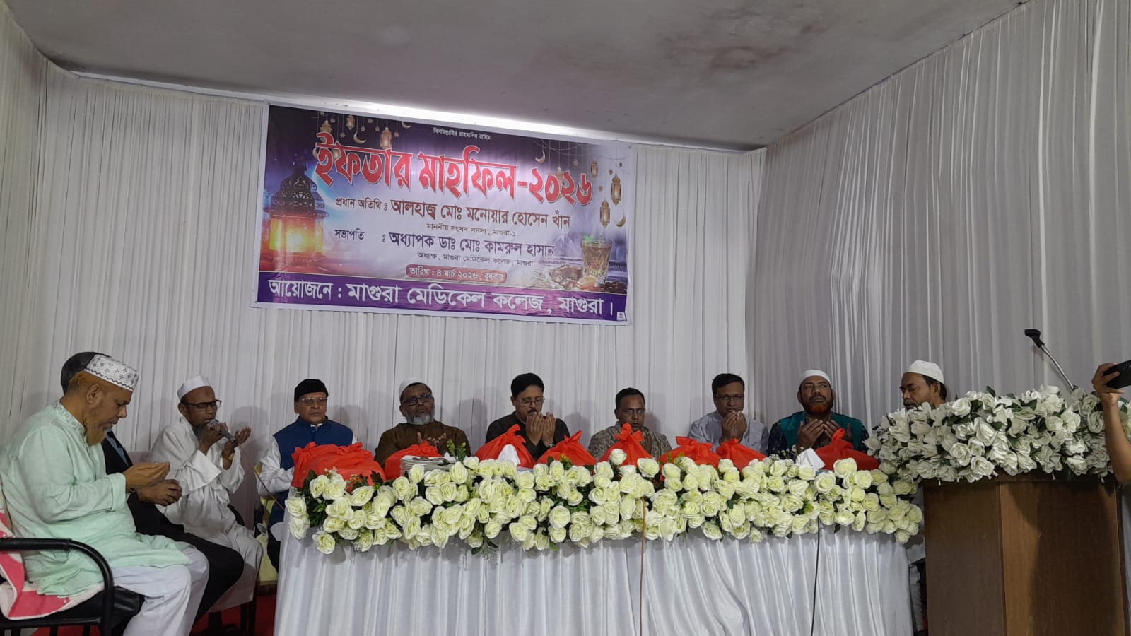 মাগুরা মেডিকেল কলেজের আয়োজনে বুধবার বিকালে মাগুরা সদর হাসপাতালের দ্বিতীয় তলায় মেডিকেল কলেজের করিডোরে ইফতার মাহফিল অনুষ্ঠিত হয়েছে। ইফতার মাহফিলে মাগুরা মেডিকেল কলেজের অধ্যাপক ডাক্তার কামরুল হাসানের সভাপতি প্রধান অতিথি ছিলেন মাগুরা-১ আসনের সংসদ সদস্য মনোয়ার হোসেন খান। ইফতার পূর্ব আলোচনা সভায় অন্যান্যের মধ্যে বক্তব্য রাখেন মাগুরা সিভিল সার্জন ডাক্তার শামীম কবির, সদর হাসপাতালের তত্ত্বাবধায়ক মহসিন ফকির,মাগুরা বিএমএ-র সভাপতি ডাক্তার আলিমুজ্জামান, মাগুরা সদর হাসপাতালে সাবেক তত্ত্বাবধায়ক ডাক্তার সুশান্ত কুমার বিশ্বাস, মাগুরা মেডিকেল কলেজের বিভাগীয় প্রধান ডাক্তার আব্দুল্লাহিল কাফি, মেডিকেল কলেজের পরিচালক ডাক্তার রবিউল ইসলাম প্রমুখ। অনুষ্ঠানে মাগুরা-১ আসনের সংসদ সদস্য মনোয়ার হোসেন খান বলেন, মাগুরা মেডিকেল কলেজের জায়গা নির্ধারণের জন্য আমরা কাজ করছি।জায়গা নির্ধারণ হলেই মাগুরা মেডিকেল কলেজের নতুন ভবনের কাজ শুরু হবে। এজন্য আমি মাগুরা বাসী সহযোগিতা কামনা করছি । অনুষ্ঠানে মেডিকেল কলেজের শিক্ষার্থী, মেডিকেল কলেজের ডাক্তারসহ সুধীজন উপস্থিত ছিলেন। ইফতার মাহফিলে দেওয়া পরিচালনা করেন মাগুরা সদর হাসপাতাল জামে মসজিদের পেশ ইমাম মাওলানা সাইফুল্লাহ।