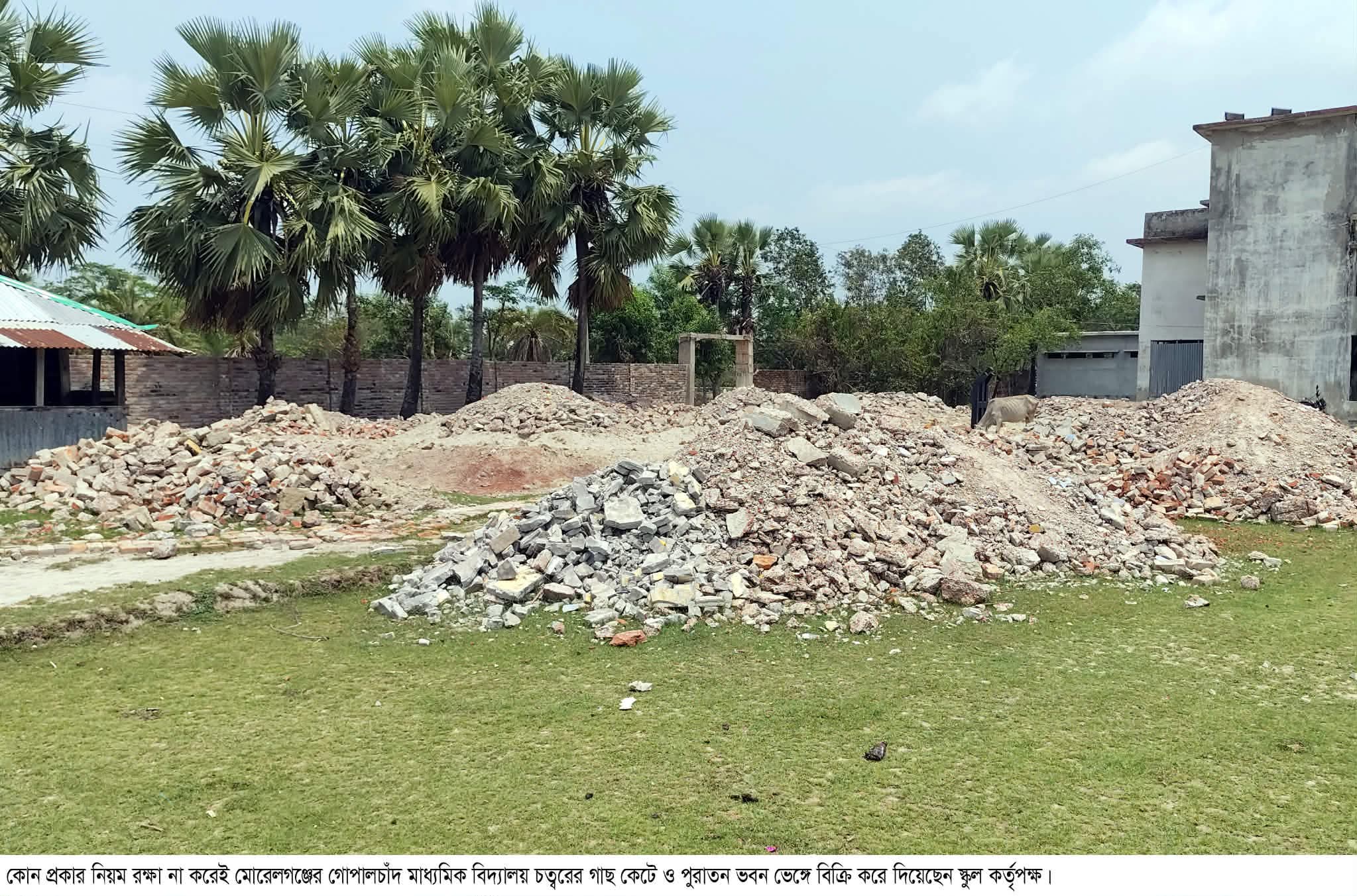 বাগেরহাটের মোরেলগঞ্জে যথাযথ কর্তৃপক্ষের অজান্তে একটি মাধ্যমিক বিদ্যালয়ের পুরাতন ভবনের মূল্য নির্ধারণ ও নিলাম আহ্বান ছাড়াই বিক্রি করে ফেলেছেন প্রধান শিক্ষক ও তার সহকর্মীরা। একই সাথে নিজেদের খেয়ালে বিদ্যালয় চত্বরে থাকা ৫টি গাছও কেটেছেন তারা, যার ৪টি ইতোমধ্যে বিক্রি করা হয়েছে। যথাযথ প্রকৃয়া সম্পন্ন করেই ভবন অপসারণ ও গাছ কেটে বিক্রি করা হয়েছে বলে প্রধান শিক্ষক দাবি করলেও উপজেলা নির্বাহী কর্মকর্তা বলছেন, ভবন ভাঙ্গা ও গাছ কাটার বিষয়ে তাকে কিছুই জানানো হয়নি। অতিসম্প্রতি এ ঘটনা ঘটেছে জিউধরা ইউনিয়নের গোপালচাঁদ মাধ্যমিক বিদ্যালয়ে।