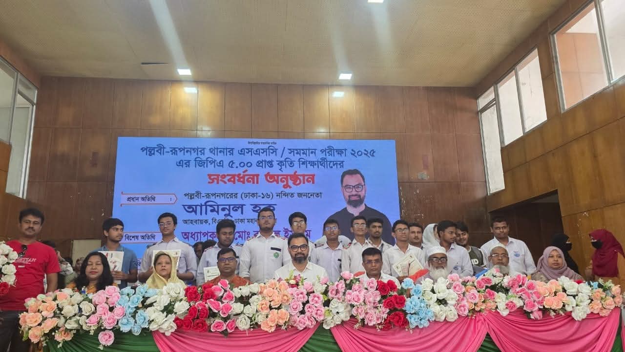 পল্লবী ও রুপনগর থানার এসএসসি ও সমমানের পরীক্ষায় জিপিএ-৫ প্রাপ্ত কৃতি শিক্ষার্থীদের মাঝে উৎসাহ ও অনুপ্রেরণা যোগাতে ঢাকা মহানগর উত্তর বিএনপির আহ্বায়ক জনাব আমিনুল হক। প্রধান অতিথি হিসেবে উপস্থিত থেকে সংবর্ধনা অনুষ্ঠানে শিক্ষার্থীদের হাতে সম্মাননা তুলে দেন তিনি।গত ২৬ জুলাই ২০২৫ ইং, রোজ- শনিবার, সকাল-১০ ঘটিকায়, ঢাকা ১৬ আসনের (রূপনগর ও পল্লবী থানার) মিরপুর গার্লস আইডিয়াল স্কুল & কলেজ, মিরপুর-১০ নাম্বার জিপিএ ৫ প্রাপ্ত ছাত্র ছাত্রীদের সম্বর্ধনা প্রদান করা হয়।
