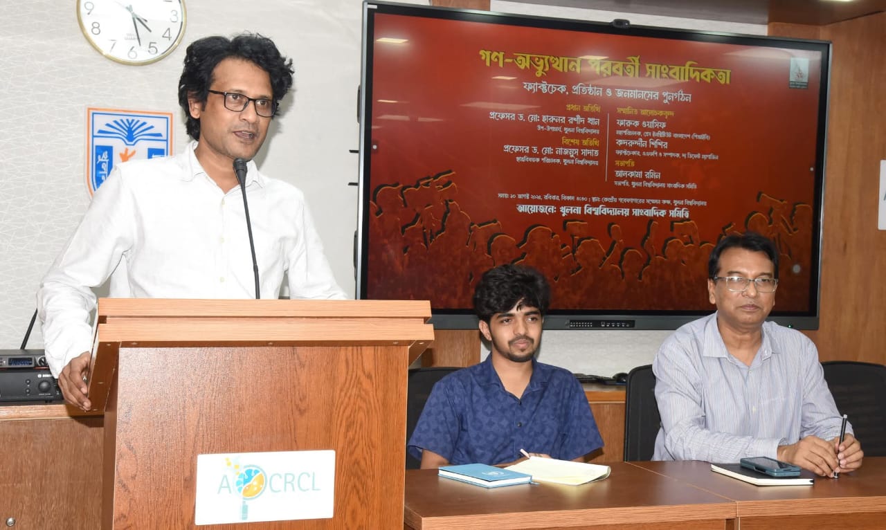 খুলনা বিশ্ববিদ্যালয় সাংবাদিক সমিতি (খুবিসাস)-এর উদ্যোগে ‘গণঅভ্যুত্থান পরবর্তী সাংবাদিকতা: ফ্যাক্টচেক, প্রতিষ্ঠান ও জনমানসের পুনর্গঠন’ শীর্ষক আলোচনা আজ ১০ আগস্ট (রবিবার) অনুষ্ঠিত হয়। বিকালে বিশ্ববিদ্যালয়ের কেন্দ্রীয় গবেষণাগারের সম্মেলন কক্ষে আয়োজিত আলোচনা অনুষ্ঠানে প্রধান অতিথির বক্তব্য রাখেন উপ-উপাচার্য প্রফেসর ড. মোঃ হারুনর রশীদ খান।