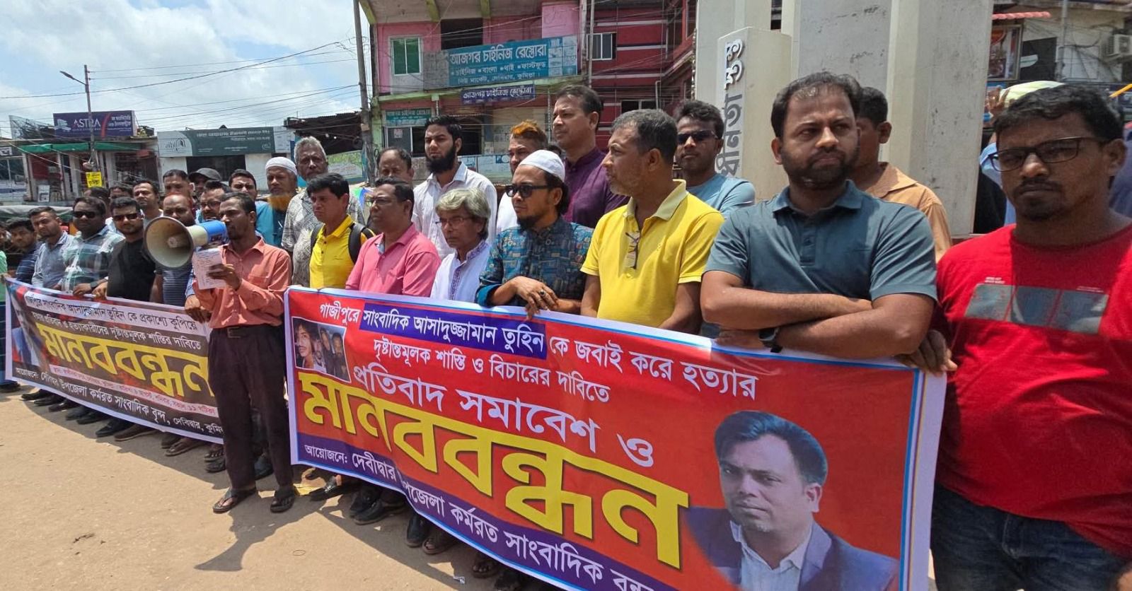 উল্লেখ্য, আসাদুজ্জামান তুহিন (৩২) দৈনিক প্রতিদিনের কাগজ পত্রিকার গাজীপুর প্রতিনিধি ছিলেন। গত বৃহস্পতিবার রাতে গাজীপুর চান্দনা চৌরাস্তা ঈদগাহ মার্কেটের সামনে প্রকাশ্যে কুপিয়ে ও গলা কেটে হত্যা করে দুর্বৃত্তরা। এর আগে তিনি ওই এলাকায় এক ব্যক্তির ওপর হামলার দৃশ্য ভিডিও ধারণ করেছিলেন। সাংবাদিকতার পাশাপাশি তুহিন একটি ওষুধ কোম্পানির প্রতিনিধির কাজও করতেন।