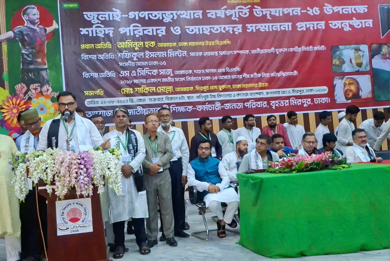 শুক্রবার (২২ আগস্ট) বিকেলে মনিপুর উচ্চ বিদ্যালয় অডিটোরিয়ামে বৃহত্তর মিরপুরস্থ জাতীয়তাবাদী শিক্ষক কর্মচারী জনতা পরিবারের উদ্যোগে আয়োজিত ‘জুলাই গণ-অভ্যুত্থান বর্ষপূর্তি উদযাপন-২০২৫ ও শহীদ পরিবার ও আহতদের সম্মাননা প্রদান’ অনুষ্ঠানে প্রধান অতিথির বক্তব্যে তিনি এসব কথা বলেন।