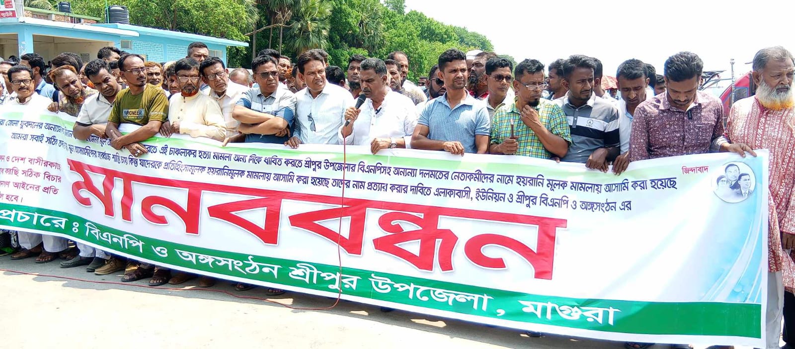 মাগুরার শ্রীপুরে জেলা যুবদলের নেতা মোঃ মিরান হোসেন হত্যা মামলায় নাকোল ইউনিয়ন বিএনপির সাবেক সভাপতি মহব্বত হোসেন ও সব্দালপুর ইউনিয়ন পরিষদের সাবেক ইউপি সদস্য ও বিএনপি নেতা নেতা হাফিজার রহমান ও বিএনপি নেতা প্রিন্সের নামে মিথ্যা মামলার প্রতিবাদে বিক্ষোভ মিছিল ও মানববন্ধন অনুষ্ঠিত হয়েছে। রোববার বেলা ১১টার দিকে উপজেলা বিএনপির কার্যালয়ের সামনে থেকে বিএনপি ও অঙ্গ সংগঠনের আয়োজনে একটি বিক্ষোভ নিয়ে শ্রীপুর কুমার নদের ব্রীজের উপর থেকে শুরু হয়ে সরকারি মহেশ চন্দ্র পাইলট মাধ্যমিক বিদ্যালয় ও কেন্দ্রীয় জামে মসজিদের সামনে এসে মানববন্ধন করে।