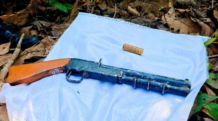 রামগড় (খাগড়াছড়ি) প্রতিনিধি: খাগড়াছড়ির রামগড়ে পরিত্যক্ত অবস্থায় একটি দেশীয় তৈরি এলজি কাঠের বাটসহ লম্বা অনুমান ১৮.৫ইঞ্চি ও ১ রাউন্ড কার্তুজ (তাজা) উদ্ধার করেছে রামগড় থানা পুলিশ। রবিবার দুপুরে গোপন সংবাদের