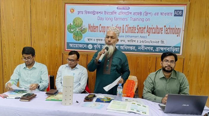 ইব্রাহীম খলিল, নবীনগর (ব্রাহ্মণবাড়িয়া) প্রতিনিধি: ব্রাহ্মণবাড়িয়ার নবীনগর উপজেলায় “ফ্ল্যাড রিকনস্ট্রাকশন ইমারজেন্সি এসিস্ট্যান্স প্রজেক্ট”-এর আওতায় ধান, গম, ভুট্টা ও ডালজাতীয় ফসলের উৎপাদন বৃদ্ধি বিষয়ক দিনব্যাপী কৃষক প্রশিক্ষণ অনুষ্ঠিত হয়েছে। সোমবার দিনব্যাপী
