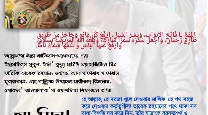 হে আল্লাহ, হে দরজা খুলে দেওয়ার মালিক, হে পথ সহজ করে দেওয়ার কর্তৃত্বশীল! তারেক রহমানের পথে থাকা সব বাধা-বিপত্তি দূর করে দিন, তাঁর যাত্রাকে বরকতপূর্ণ ও নিরাপদ করুন। তাঁকে সুস্থতার
