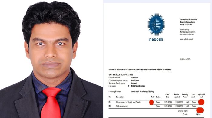 আবু রায়হান, স্টাফ রিপোর্টার- সুন্দরবন ২৪-এর সম্পাদক এবং প্রতিষ্ঠাতা স্বত্বাধিকারী মো. শাওন হোসেন আন্তর্জাতিকভাবে স্বীকৃত হেল্থ অ্যান্ড সেইফটি (NEBOSH) পরীক্ষায় সফলভাবে উত্তীর্ণ হয়েছেন। তার এই অর্জনে সহকর্মী, শুভানুধ্যায়ী ও মিডিয়ার