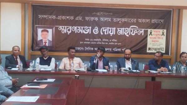নিজস্ব প্রতিনিধি:- ফারুক আলম তালুকদারের স্মৃতির প্রতি শ্রদ্ধা জানাতে দৈনিক আলোর জগত পত্রিকা পরিবারের উদ্যোগে গতকাল ১৬ ফেব্রুয়ারি, বিকেলে জাতীয় প্রেস ক্লাবের তফাজ্জল হোসেন মানিক মিয়া হলে স্মরণ সভা এবং