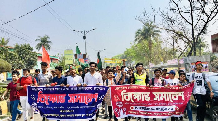 দেশব্যাপী ধর্ষণ এবং নারী নির্যাতনের প্রতিবাদে খুলনা পাবলিক কলেজ ও খুলনা সরকারি মডেল স্কুল এন্ড কলেজের শিক্ষার্থীরা বিক্ষোভ সমাবেশ, মানববন্ধন ও সড়ক অবরোধ করেছে। মঙ্গলবার সকাল সাড়ে ১০টা থেকে দুপুর