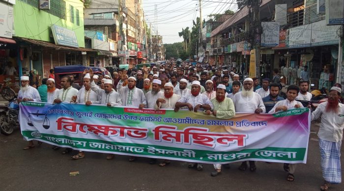 মোঃ সাইফুল্লাহঃ মাগুরায় গোপালগঞ্জে জুলাই যোদ্ধাদের উপর বর্বরোচিত হামলার প্রতিবাদে বিক্ষোভ মিছিল ও সমাবেশ করেছে জেলা জামায়াতে ইসলামী। বৃহস্পতিবার বিকালে মাগুরা শহরের ভায়নার মোড় এলাকা থেকে বিক্ষোভ মিছিলটি শুরু হয়ে