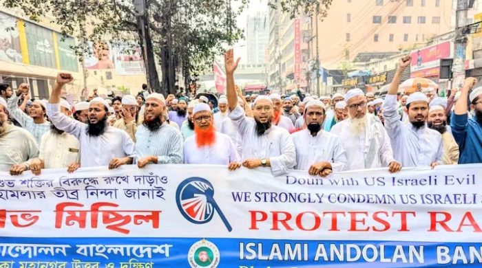 নিজস্ব প্রতিবেদকঃ ইরানে যুক্তরাষ্ট্র ও ইসরায়েলের হামলার প্রতিবাদে রাজধানীতে বিক্ষোভ মিছিল ও সমাবেশ করেছে ইসলামী আন্দোলন বাংলাদেশ। দলটি বলেছে, পবিত্র রমজান মাসে সংঘটিত এ হামলা আন্তর্জাতিক রীতিনীতি ও বিশ্বব্যবস্থার প্রতি