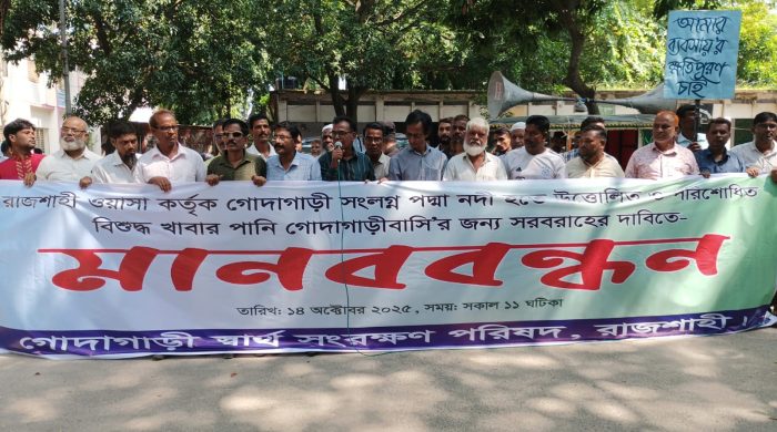নিজস্ব প্রতিবেদক, গোদাগাড়ী, রাজশাহী :- পানি নিয়ে বৈষম্য গোদাগাড়ীর মাটিতে মেনে নেওয়া হবে না। গোদাগাড়ী স্বার্থ সংরক্ষণ পরিষদের ব্যানারের এক মানববন্ধন অনুষ্ঠানে এ কথা বলেন গোদাগাড়ী উপজেলা কৃষক দলের আহবায়ক