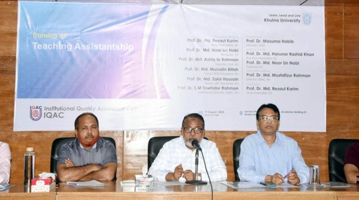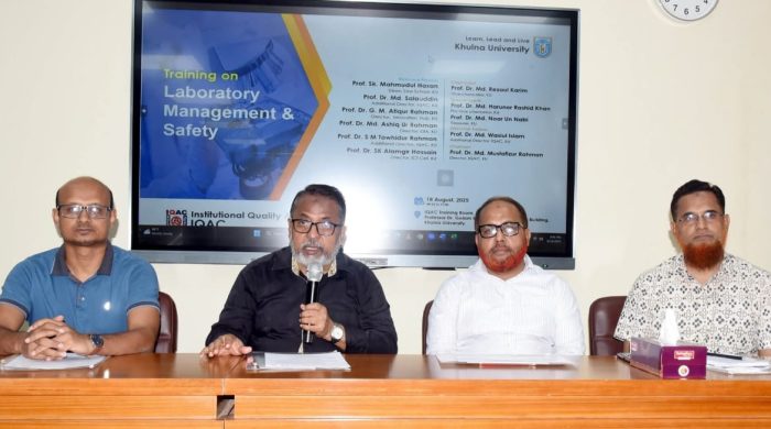 খুলনা বিশ্ববিদ্যালয়ের ইনস্টিটিউশনাল কোয়ালিটি অ্যাসুরেন্স সেল (আইকিউএসি)-এর উদ্যোগে ‘ল্যাবরেটরি ম্যানেজমেন্ট এন্ড সেফটি’ শীর্ষক দিনব্যাপী এক প্রশিক্ষণ অনুষ্ঠিত হয়েছে। আজ ১৮ আগস্ট (সোমবার) সকাল ৯.৩০ মিনিটে এ প্রশিক্ষণের উদ্বোধনী অনুষ্ঠানে প্রধান
