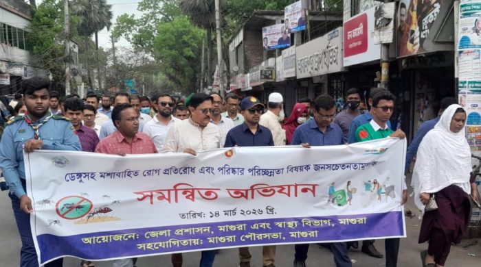 মোঃ সাইফুল্লাহ, মাগুরা প্রতিনিধি // মাগুরায় ডেঙ্গুসহ মশাবাহিত রোগ প্রতিরোধ ও পরিষ্কার পরিচ্ছন্নতা বিষয়ক জনসচেতনতামুলক সমন্বিত অভিযান শুরু হয়েছে। এ উপলক্ষে আজ শনিবার সকালে জেলা প্রশাসন ও স্বাস্থ্য বিভাগের আয়োজনে