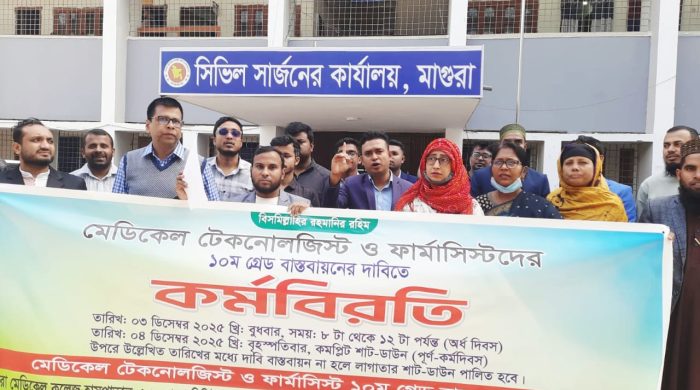 মোঃ সাইফুল্লাহ, মাগুরা প্রতিনিধি // স্বাস্থ্য ও পরিবার কল্যাণ মন্ত্রণালয়ের অধীনে সারাদেশের সকল সরকারি মেডিকেল সেন্টারের ডিপ্লোমা মেডিকেল টেকনোলজিস্ট ও ফার্মাসিস্টদের দশম গ্রেড বাস্তবায়নের দাবিতে মাগুরায় বুধবার অর্ধ দিবস কর্মবিরতি
